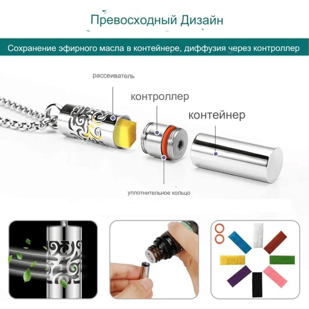 Кулон состоит из 4 частей: Рассеиватель, контроллер, уплотнительное кольцо, контейнер под эфирное масла.