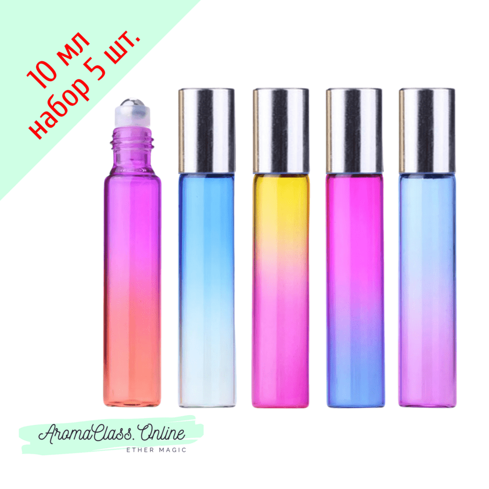 Набор флаконов с роллером, 10мл, градиент 5 цветов, серебристая крышка, металлический шарик